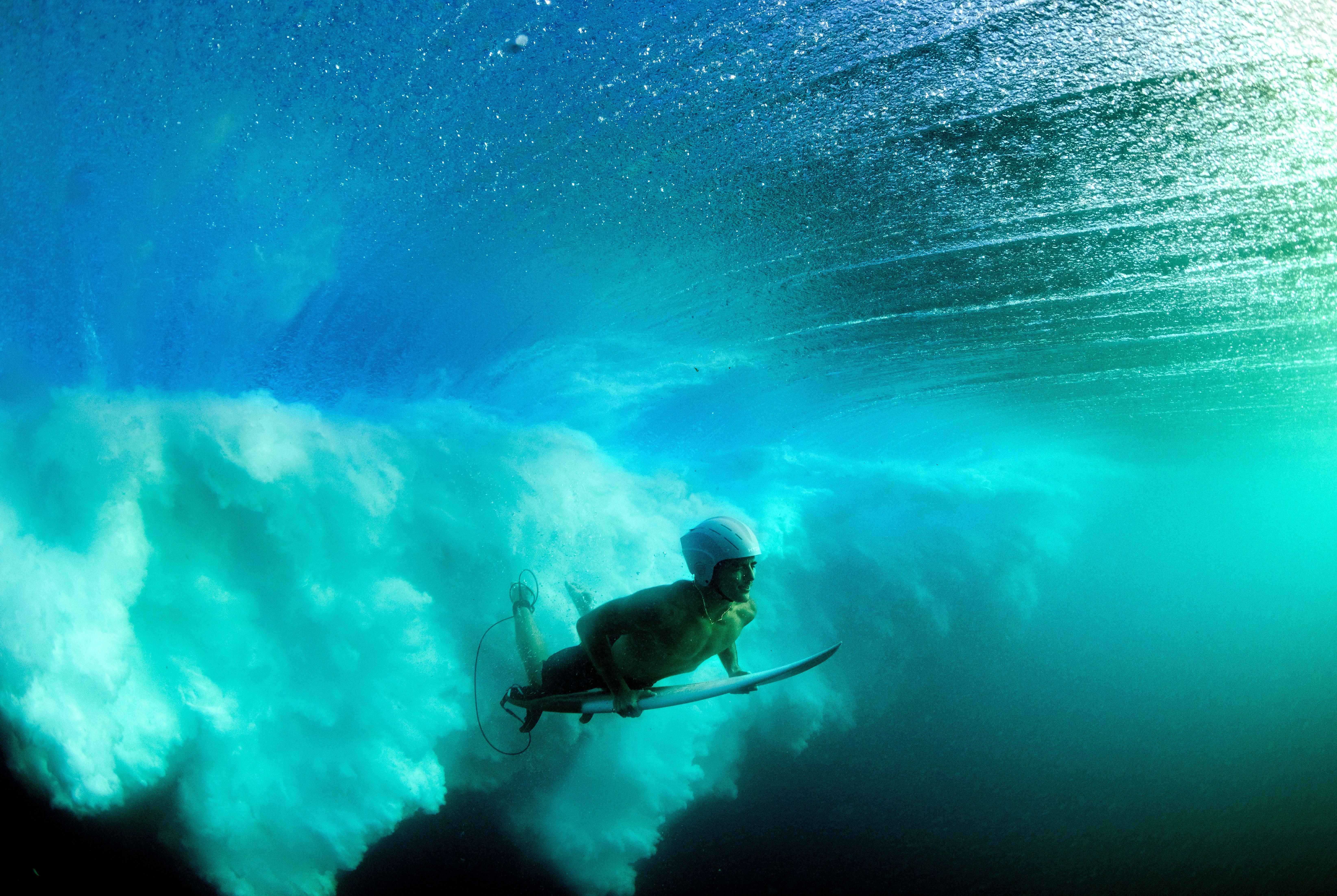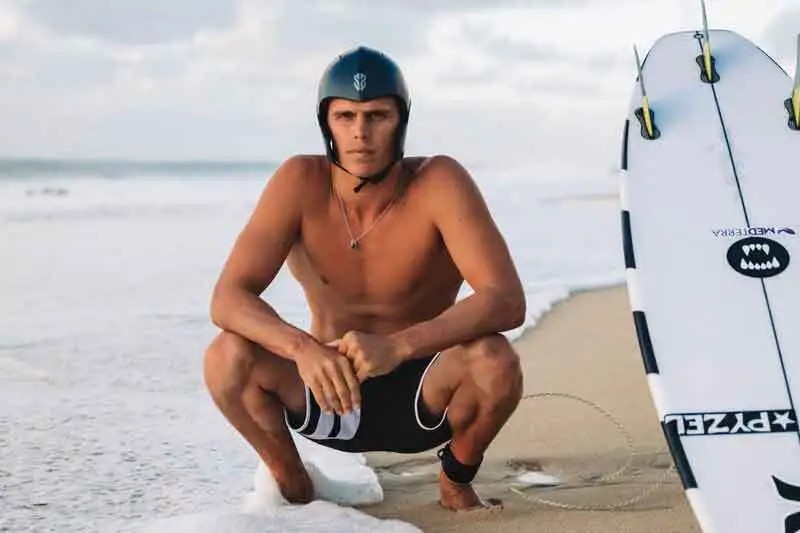 Hierbei handelt es sich um den Elite High-Performance-Helm von Hyda, entwickelt für anspruchsvolle Surfer. Er nutzt den Coanda-Effekt für eine optimierte, hydrodynamische Strömung und verfügt über die Energy Reduction Technology™ mit weicher Polymerpolsterung zum Schutz vor linearen und rotatorischen Aufprallkräften. Zudem ist der Helm schnell entwässernd und mit Instafit-Verstellzonen sowie einem magnetischen Kinnverschluss (FIDLOCK) für sicheren Halt ausgestattet. Der Helm ist nach EN 1385 für Wassersport zertifiziert.