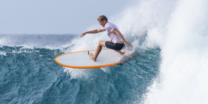 Die ausbalancierte Outline läuft aus der vollen Nose und der breiten Mid-Section in ein Swallowtail. Das Unterwasserschiff geht von einer Single- in eine Doppelkonkave über und die Nose ist leicht aufgestellt. Feingetuned wird das Ganze über die Tri-Quad Finoption. Gleiten, heizen, carven – Alles in Einem.